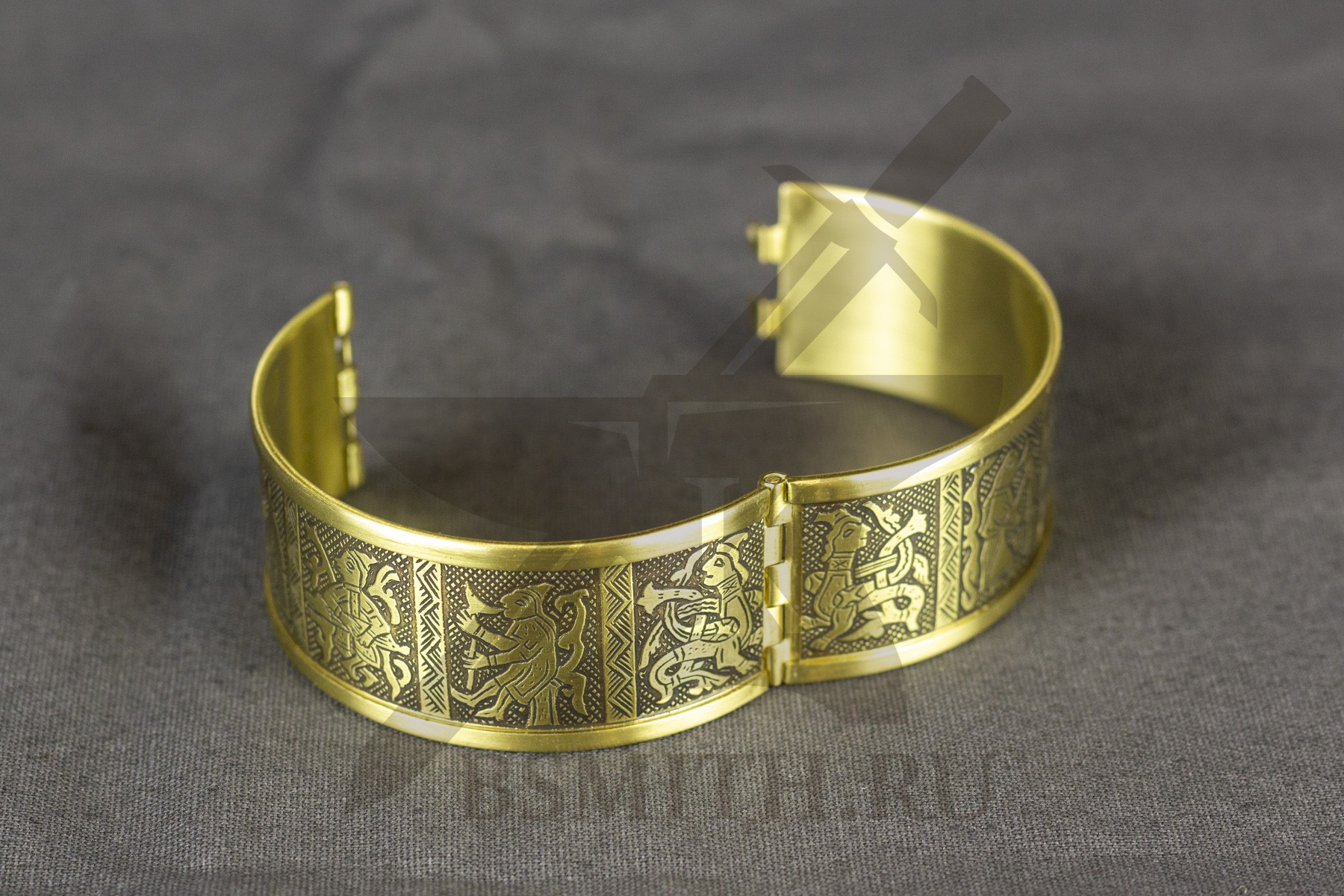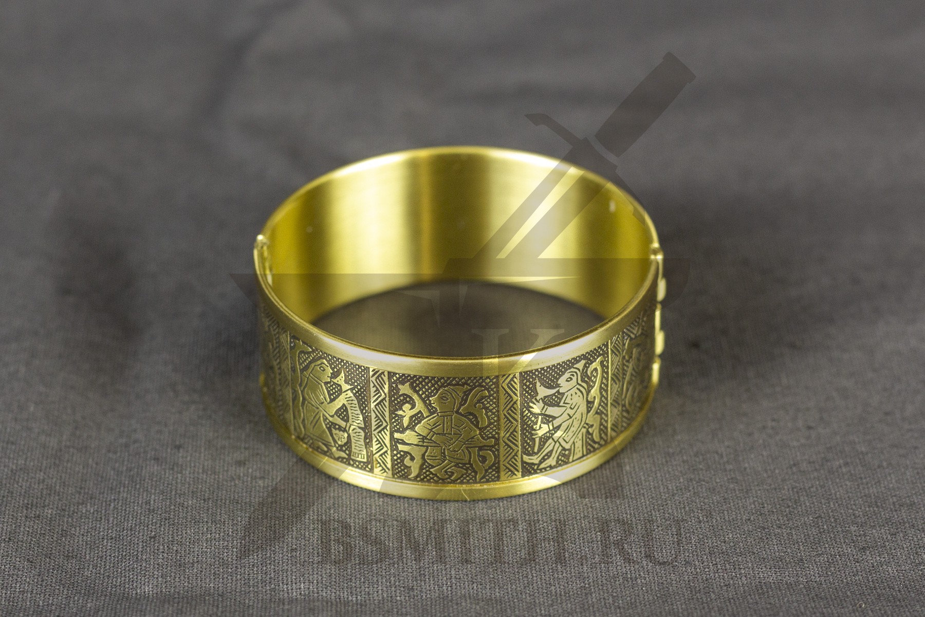 Орнамент на браслете выполнен по мотивам изображений с обруча из клада 1966 г., найденного при раскопках в Старой Рязани.