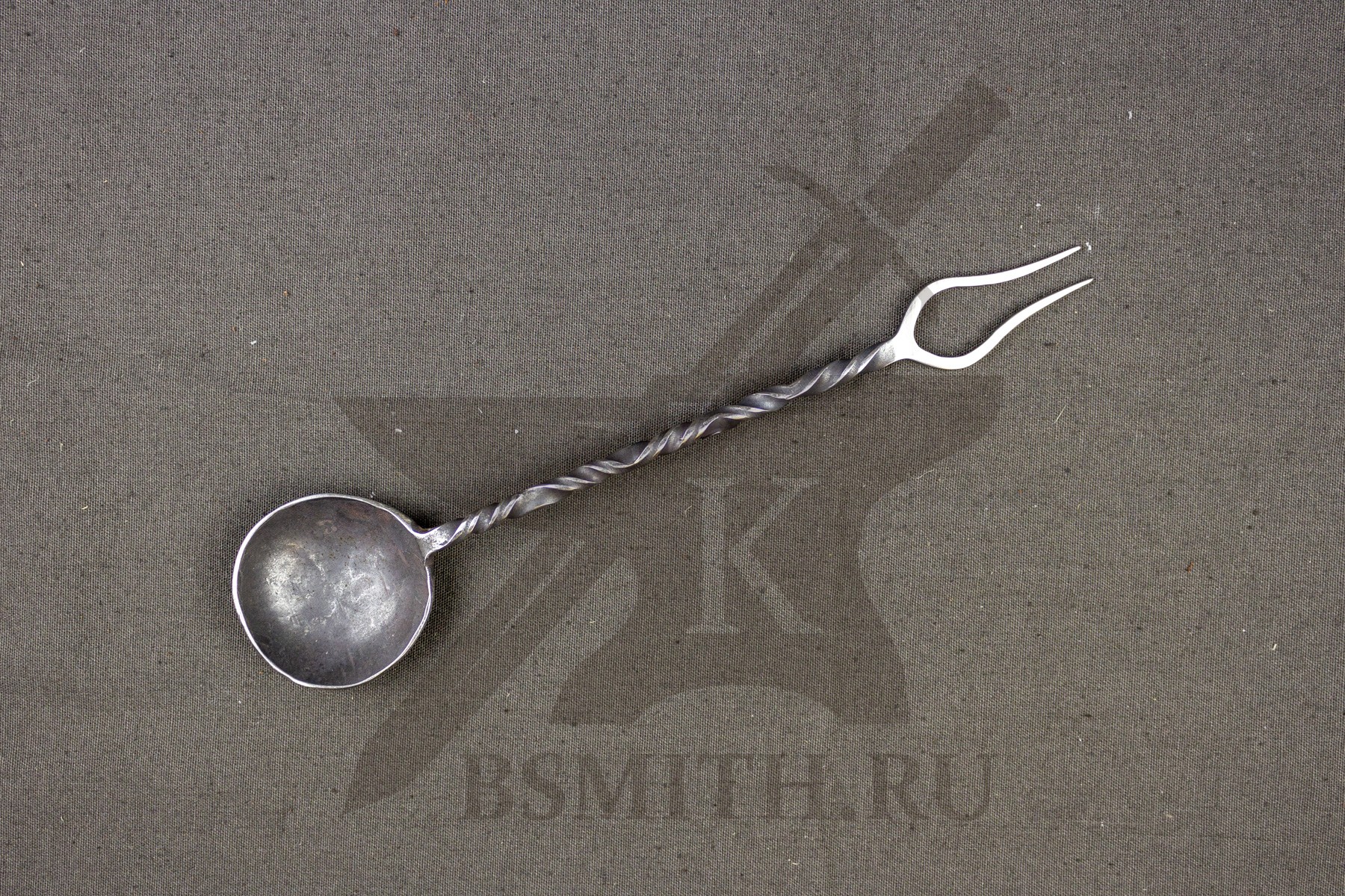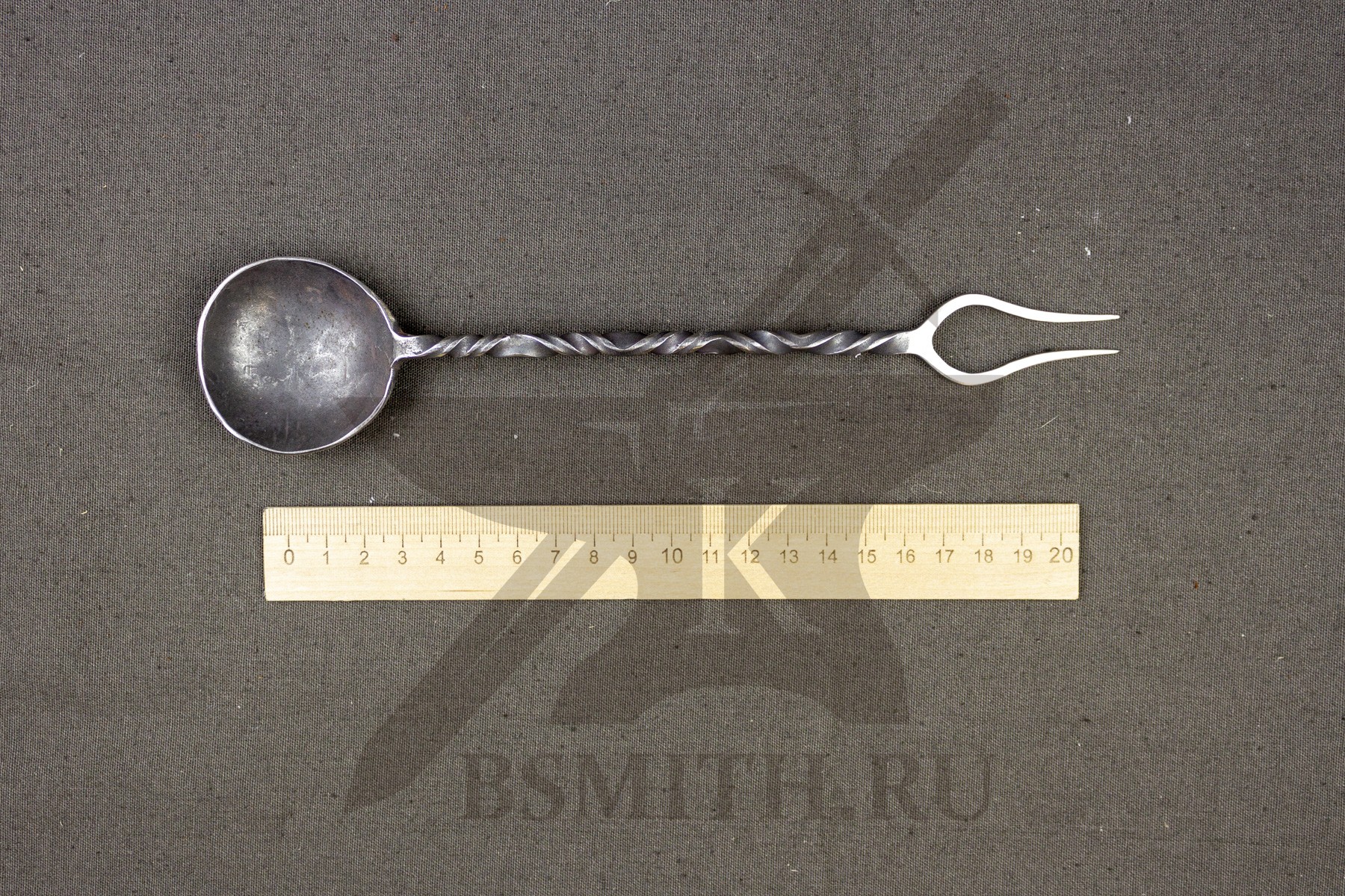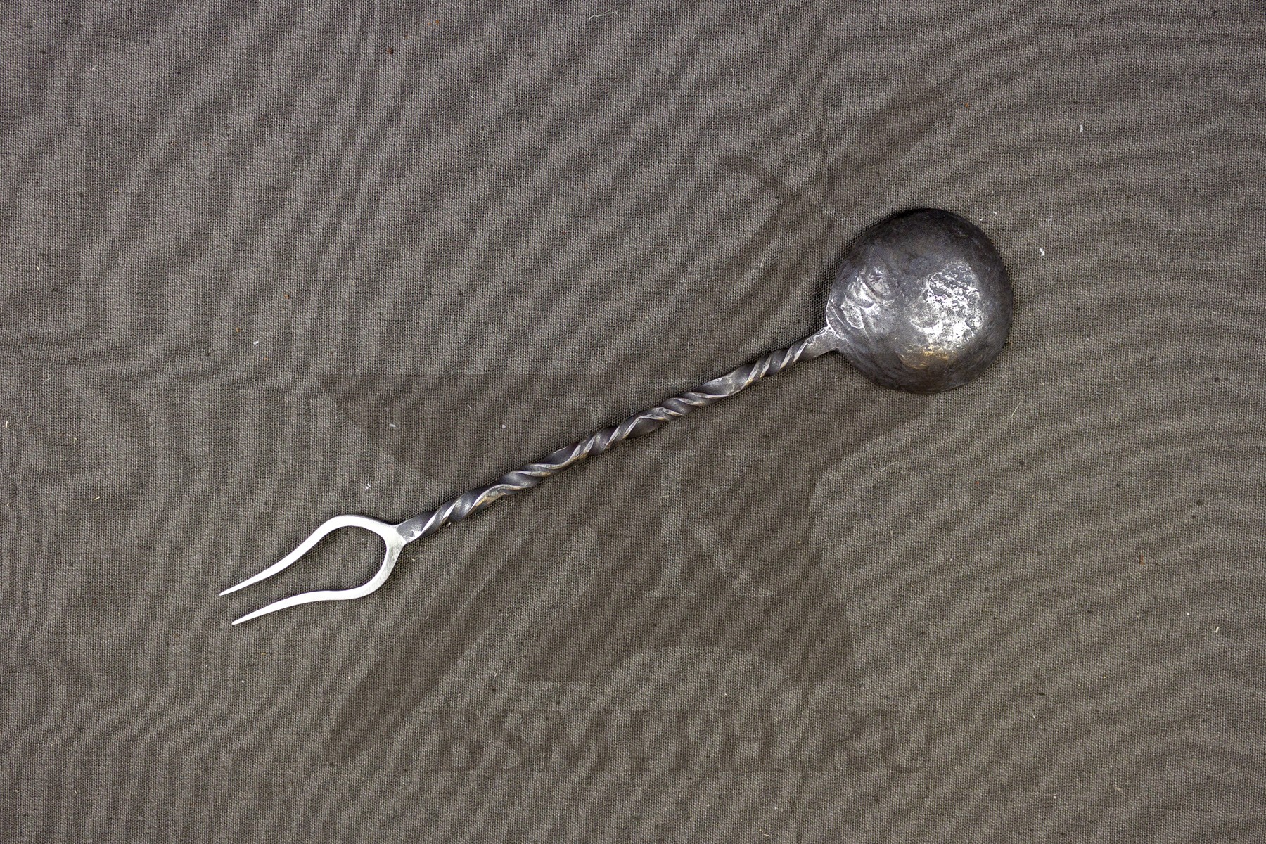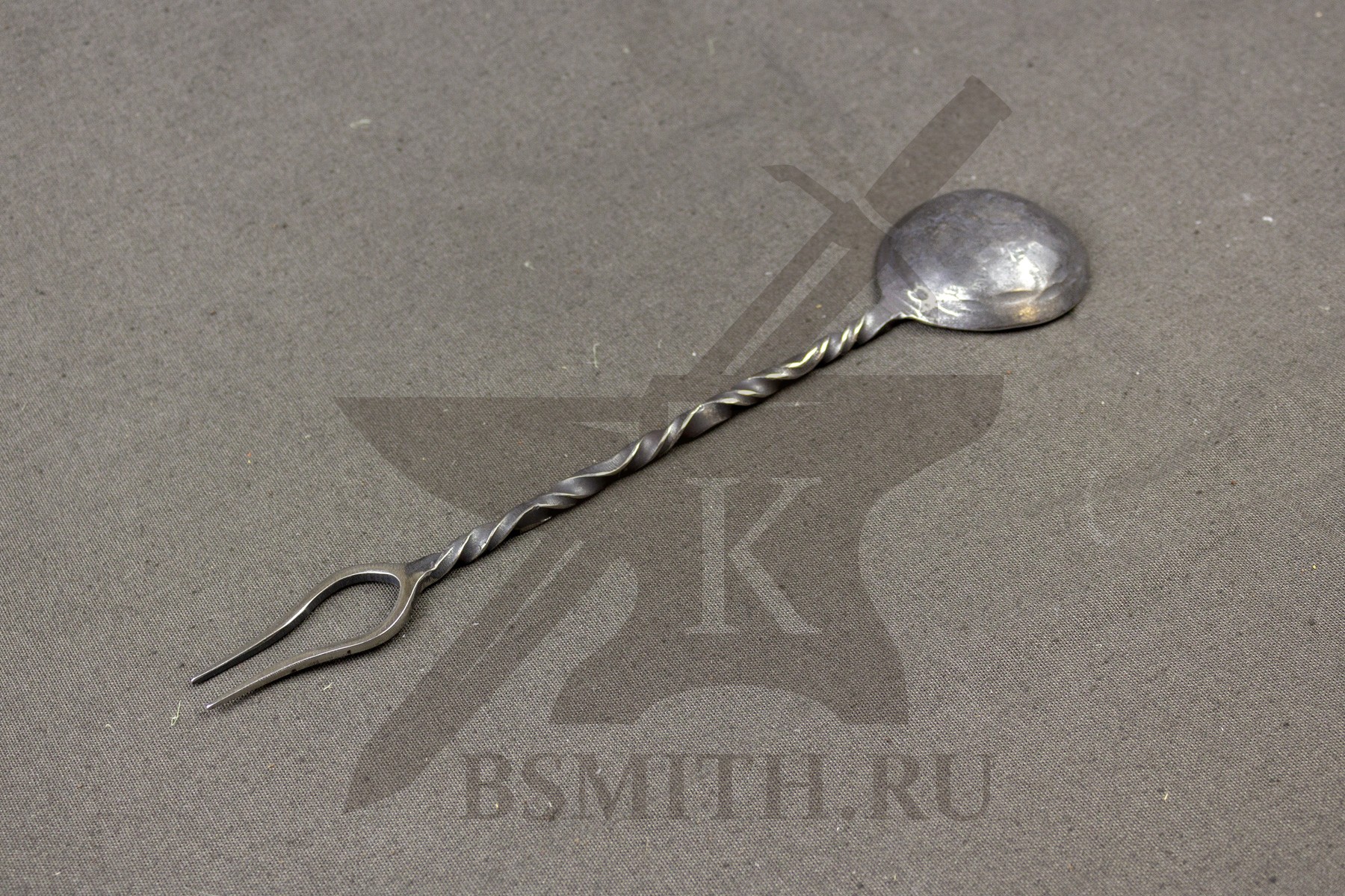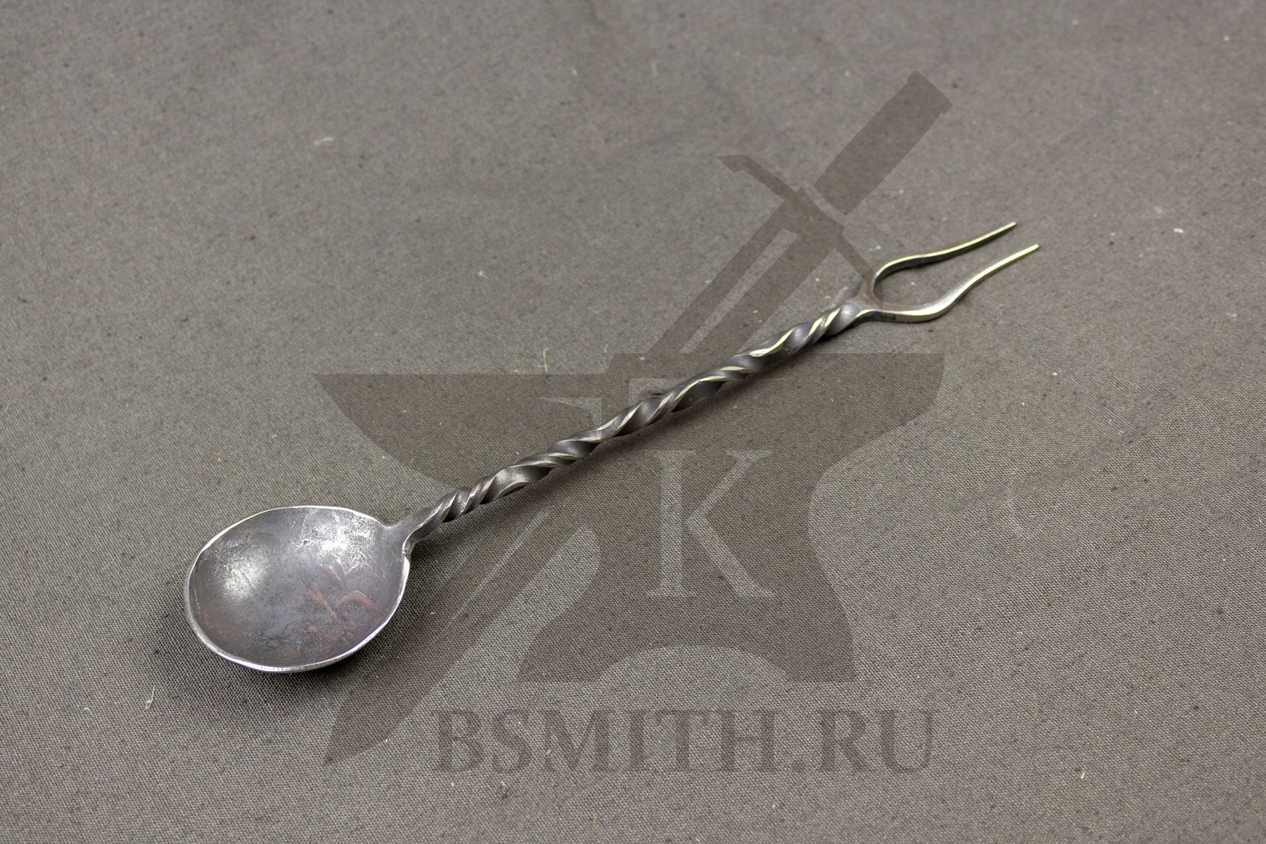 Ложка-вилка кованая с двумя зубцами, стилизация на находки подобных столовых приборов из Суздаля 14-15 веков. Вариант с простой торсировкой на рукояти.